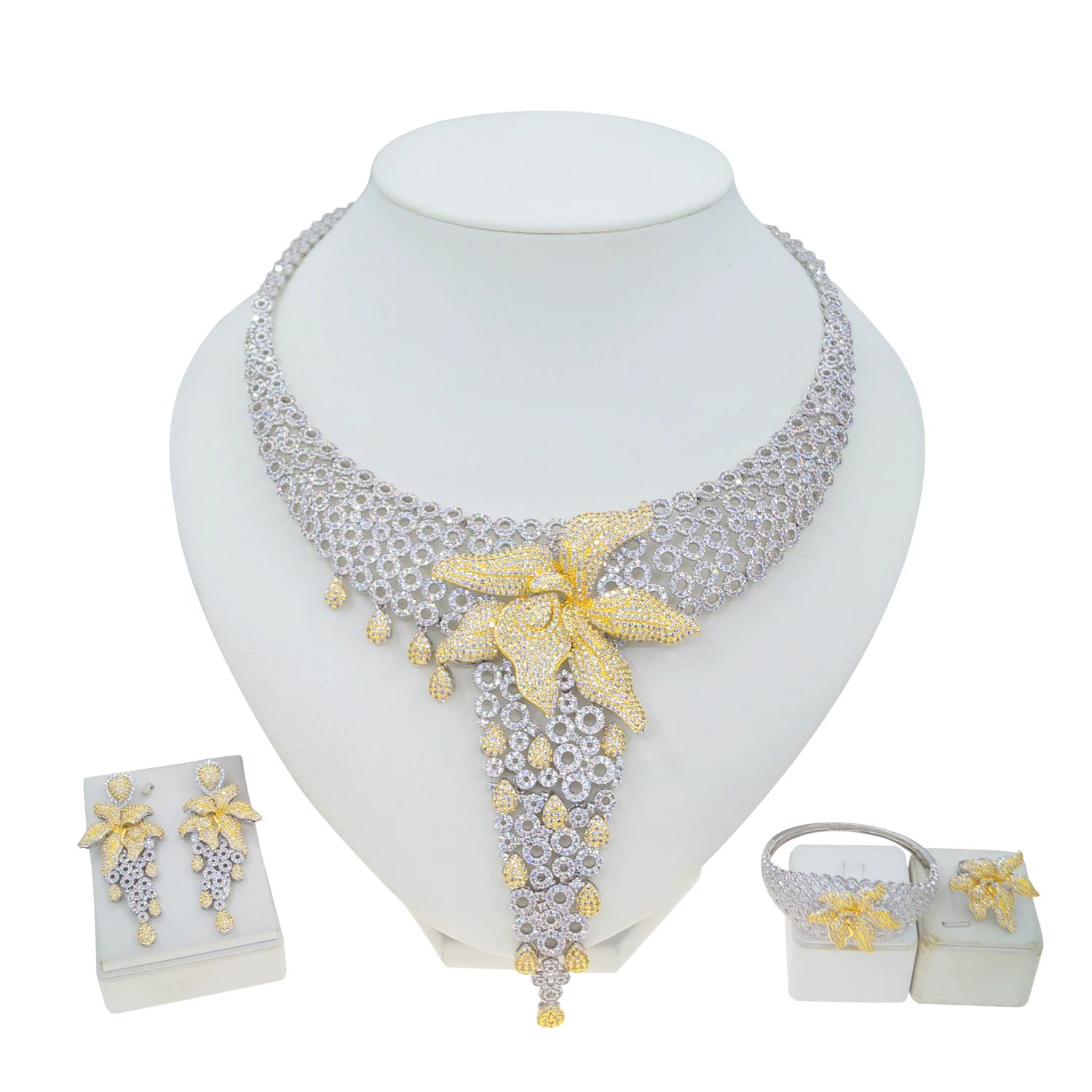 This high jewelry set features a sculptural crystal necklace with a central floral motif, framed by precision-set stones for dimensional radiance. The gold and platinum plating enhances luminosity while ensuring a polished, lasting finish.
